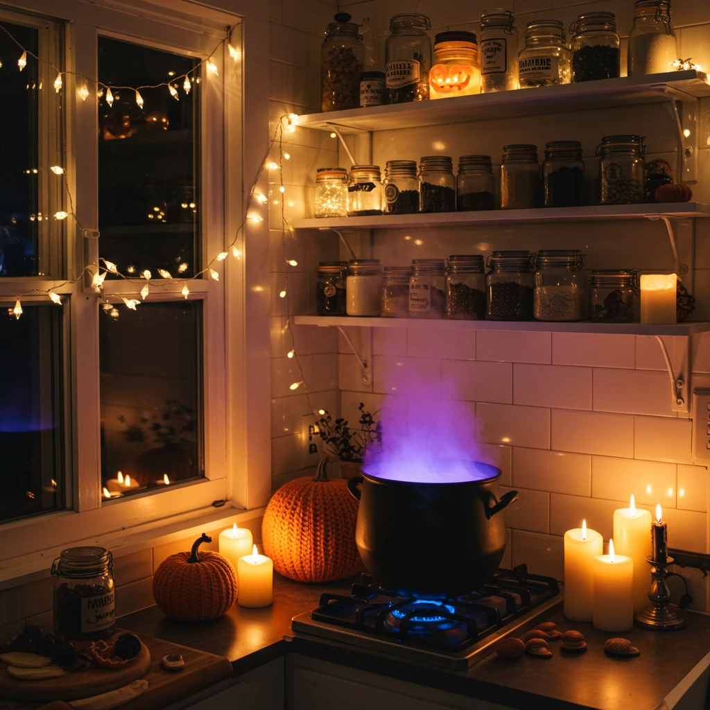 Not all Halloween kitchens need to be grand; sometimes, it’s the intimate nooks that capture the magic. Create a Cozy Cauldron Corner where warmth meets subtle witchcraft. This involves soft lighting, autumnal textures, and symbolic elements that evoke a cottage-core-meets-enchantment vibe.