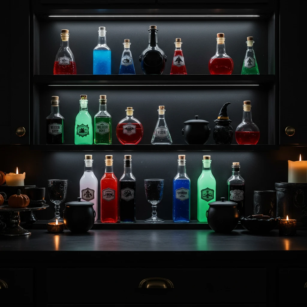 Set up a dedicated Potion Station for Halloween beverages. This concept is all about transforming a kitchen counter or a bar cart into a mystical drink dispensary. Think darkly colored liquids, unique glassware, and eerie labels that invite guests to concoct their own spooky libations.