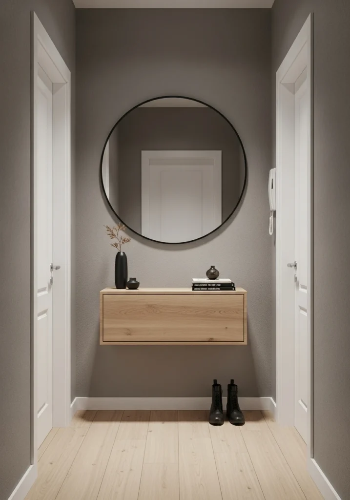 The #1 minimalist smart design for a narrow hallway. A floating or wall-mounted console table takes up zero floor space which keeps the room feeling as open and airy as possible. It provides a much-needed drop zone for keys and mail without the bulk.