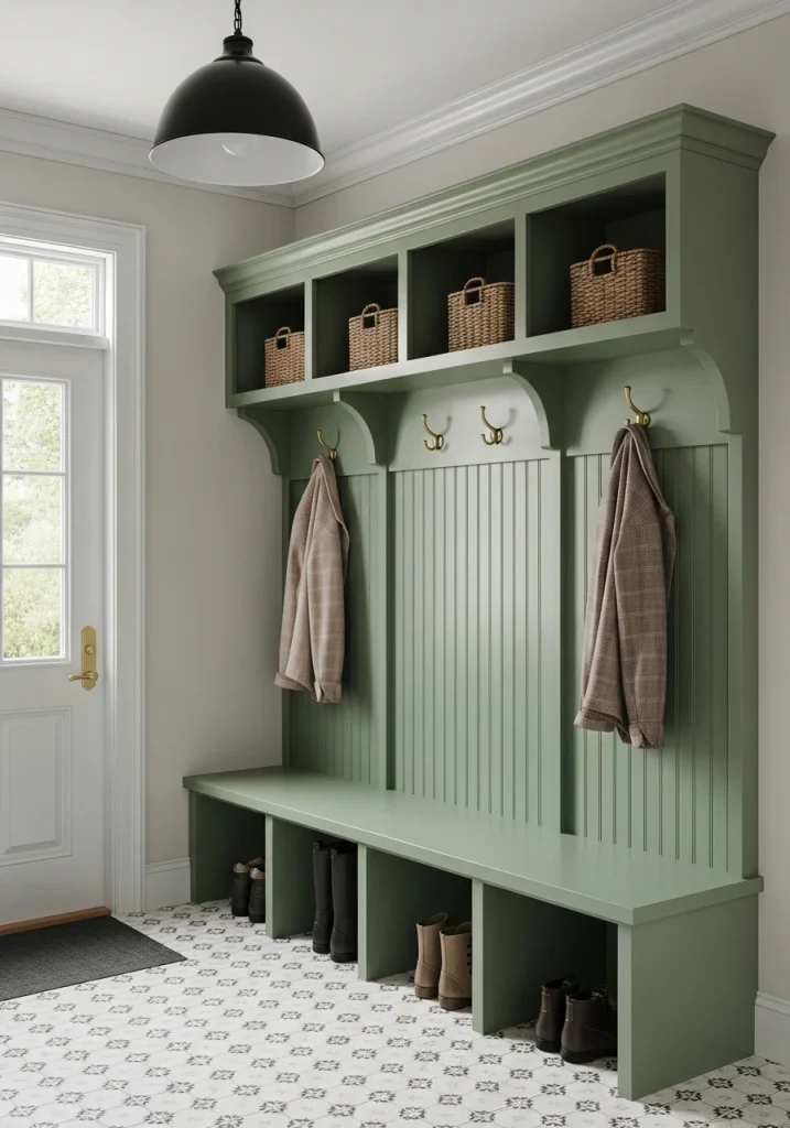 The ultimate functional makeover for a family entryway. Remodel your entry by building in a custom mudroom unit. This typically includes a bench for sitting cubbies or drawers underneath for shoes and tall locker sections with hooks for coats and bags.