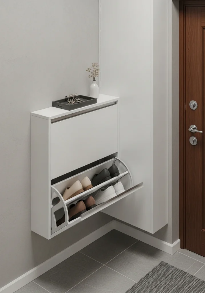 A true space-saving hero for a narrow hall. A slim shoe cabinet (like the IKEA TRONES) is only a few inches deep and has tilt-out drawers that store your shoes vertically. It keeps all the shoe clutter off the floor and the top surface acts as a small console shelf.