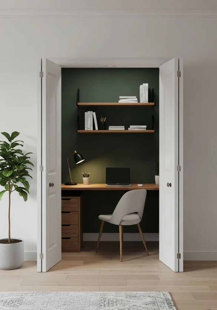 A Cloffice is a popular 2026 portmanteau for a closet office. It’s a smart remodel idea where you convert a hall closet into a compact functional home office with a built-in desktop and shelving.