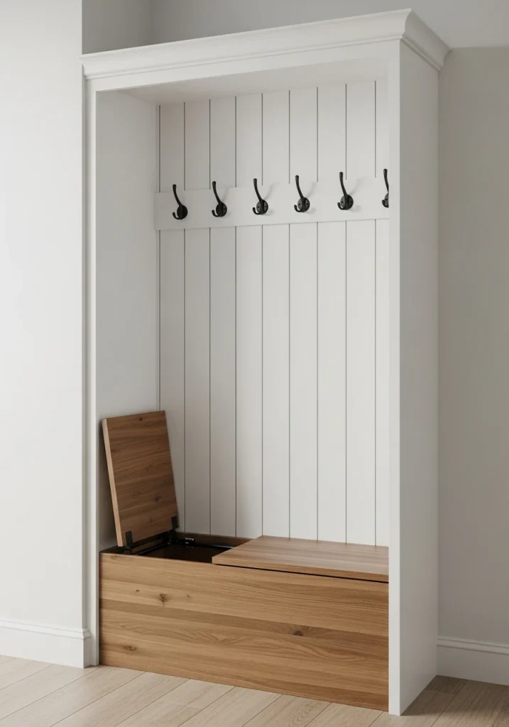 A smaller modern farmhouse version of the full mudroom (Idea #11). This remodel involves framing a small nook or alcove (perhaps between two closets) and building in a simple bench with a shiplap or beadboard back and a row of hooks.