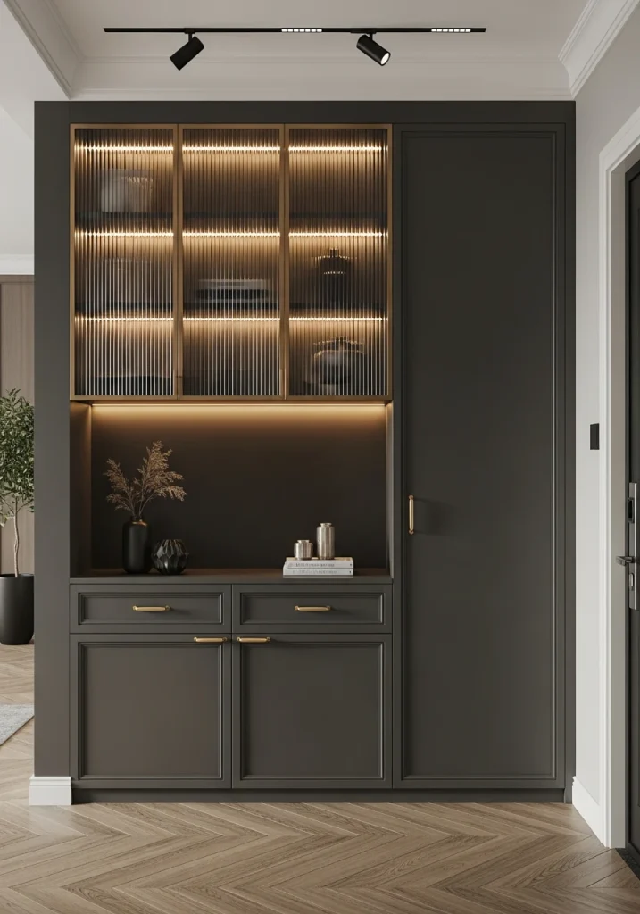 A major 2026 materials trend. For your entryway console or a storage cabinet remodel the doors to use textural fluted or reeded glass. The vertical undulating grooves diffuse light softly obscure the clutter inside (like shoes or bags) and add a beautiful subtle and vintage-inspired textural detail.