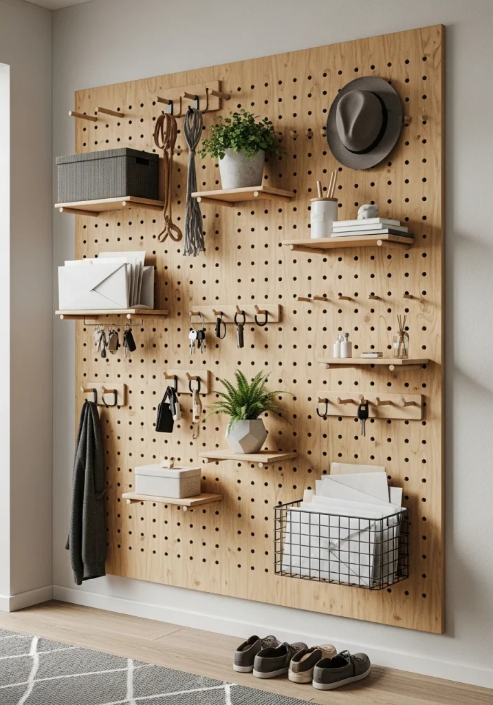 A highly versatile and stylish Scandinavian storage idea. Mount a large pegboard on the entryway wall. You can use a variety of hooks shelves and small bins to create a custom and flexible drop zone for all your keys mail sunglasses and bags.