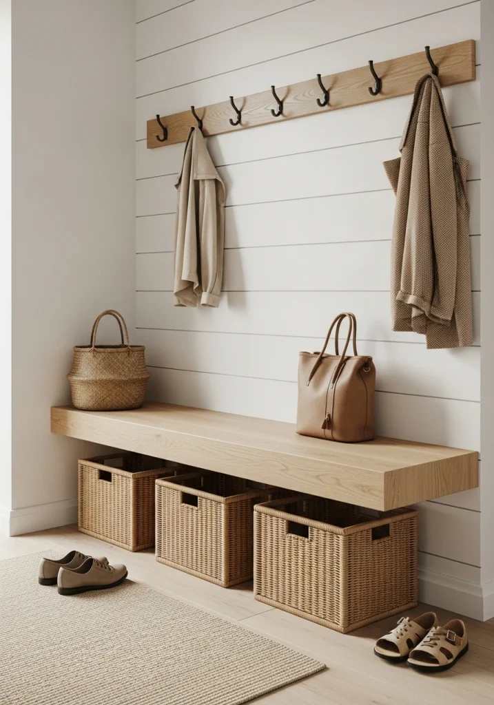 A modern and airy mudroom look. This remodel involves installing a thick floating wood bench that is mounted directly to the wall. This keeps the floor completely clear and the open space underneath is the perfect spot for a neat row of woven baskets or shoe trays.