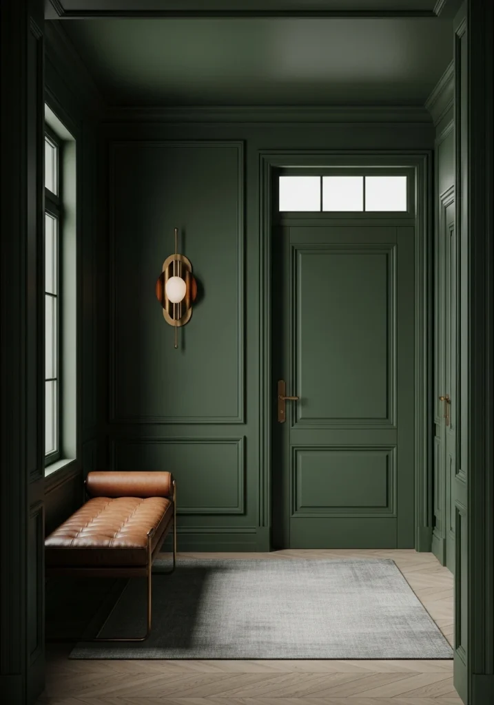 A perfect makeover for a small enclosed entryway. Embrace the color drenching 2026 trend. Paint the walls trim doors and even the ceiling in one single deep and moody color (like a rich forest green or a deep navy blue) to create an enveloping jewel-box effect.