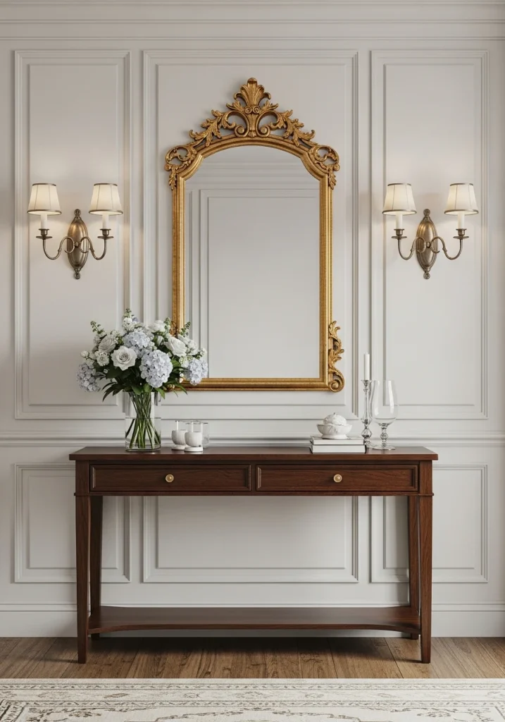 For a more formal traditional or hotel-like makeover create a perfectly symmetrical vignette. Place a slim console table against the wall hang a beautiful mirror or a piece of art above it and then install a matching pair of wall sconces to flank it on either side.