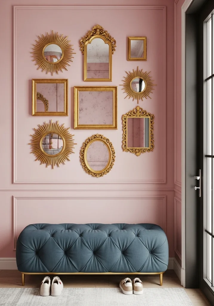 A creative makeover for a dark hallway. Instead of one large mirror create a gallery wall using a collection of smaller mismatched vintage mirrors. Look for small round or oval mirrors with beautiful ornate gold or silver frames and hang them in a tight cluster.
