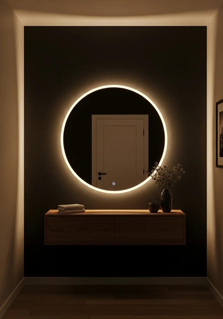 A smart design trend for a modern entryway. A backlit mirror with integrated LED lighting around the edge provides a soft ambient halo glow on the wall. It acts as a mirror a wall sconce and a piece of modern art all in one.