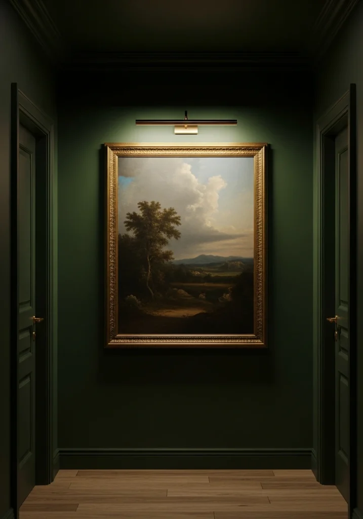 For a sophisticated dark academia or modern traditional 2026 makeover hang a large moody landscape painting or a classic portrait in your hallway. Then install a classic picture light (a long thin brass or black light) on the wall directly above it to give it a museum-quality feel.