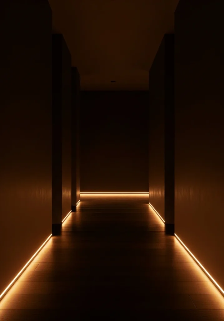 A very modern high-tech remodel idea. This involves installing a recessed LED light strip along the baseboard or skirting of your hallway. This provides a soft glowing pathway light that is perfect for nighttime navigation and creates a very cool floating wall effect.