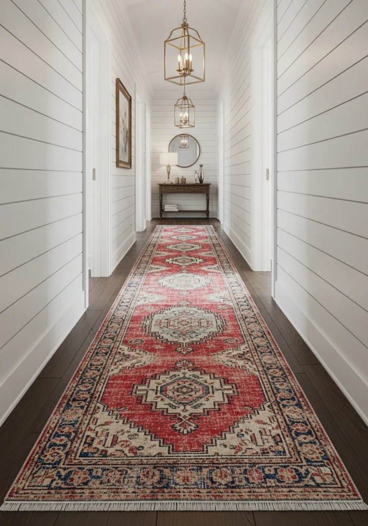 The single most important decor item for a long hallway. A runner rug is essential for adding color pattern and cozy warmth underfoot. A vintage Turkish or Persian runner with a faded pattern is a top 2026 trend for adding soul and collected character.