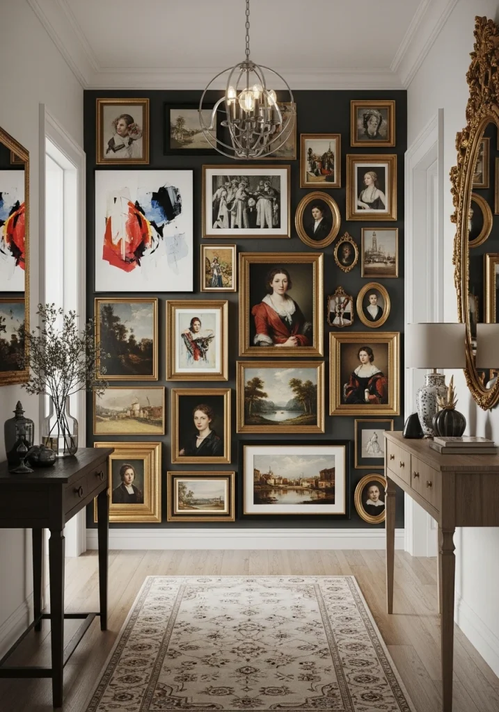 The 2026 collected trend is perfect for a hallway. Remodel a blank wall by creating a stunning salon-style hang that confidently mixes modern abstract art with antique oil paintings family photos (in black and white) and personal objects in a variety of mismatched yet cohesive frames.