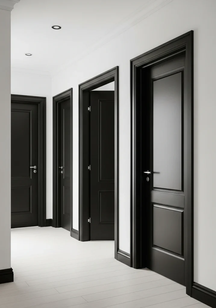 A high-impact low-cost makeover idea. Keep your hallway walls a simple neutral color and then paint all the doors (and even the door trim) that lead off the hallway in a single bold statement color. A deep satin black or a moody green is incredibly chic.