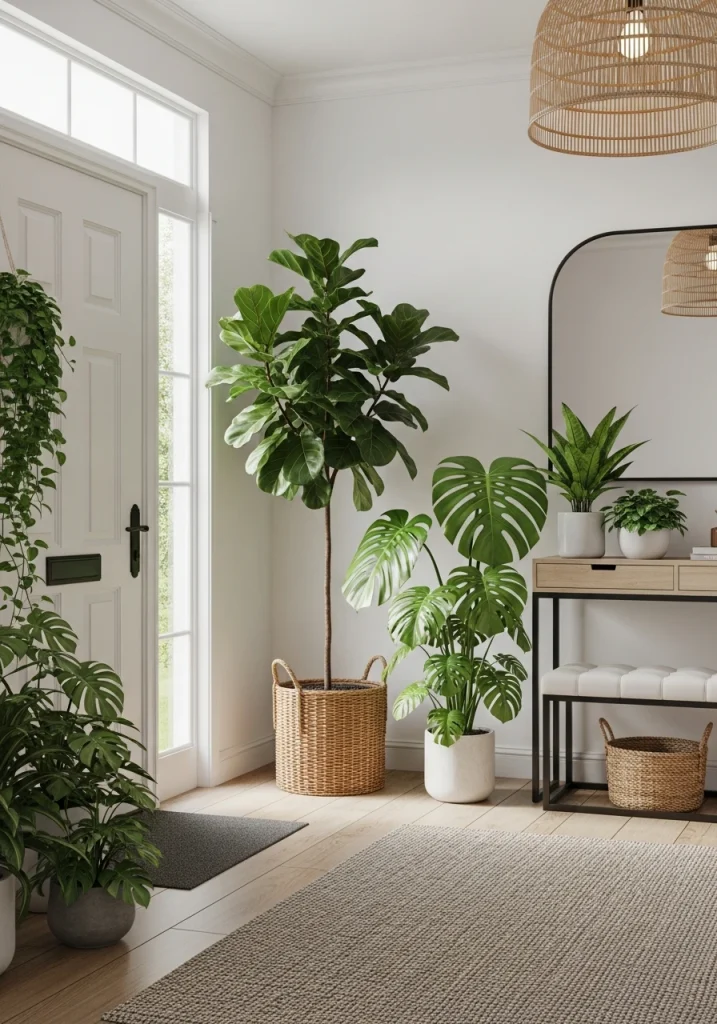 A core 2026 organic modern trend. Even a dark hallway can have biophilia (life). Create a plant nook on your console table with a few low-light-tolerant plants (like a snake plant or a ZZ plant) in beautiful ceramic planters to add a fresh organic element.