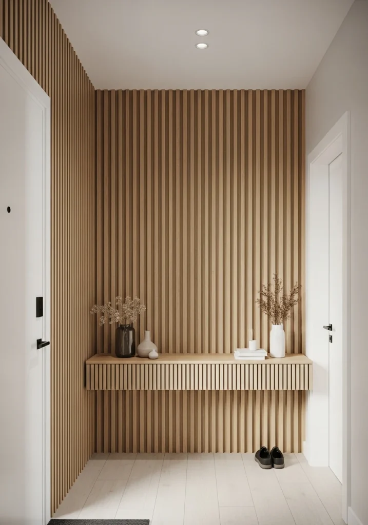 A key feature of the Japandi and Organic Modern 2026 aesthetic. Remodel your main entryway wall with vertical wood slats (especially in a light oak or a rich walnut). This adds a clean architectural and rhythmic textural element that is both sophisticated and visually warming.