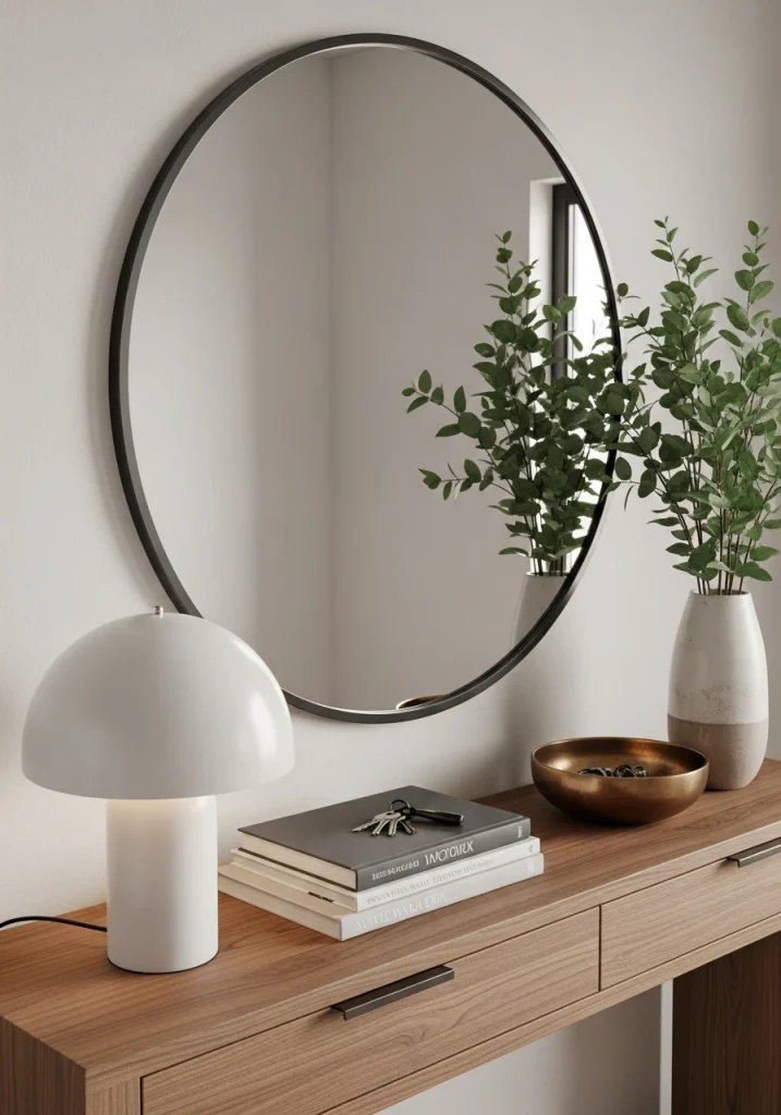 A major 2026 trend for entryways. A large arched mirror (at least 6 feet tall) with a thin metal frame (often black or brass) leaned casually against the wall. This acts as a full-length mirror a stylish sculptural object and a powerful tool to bounce light and make the hall feel huge.