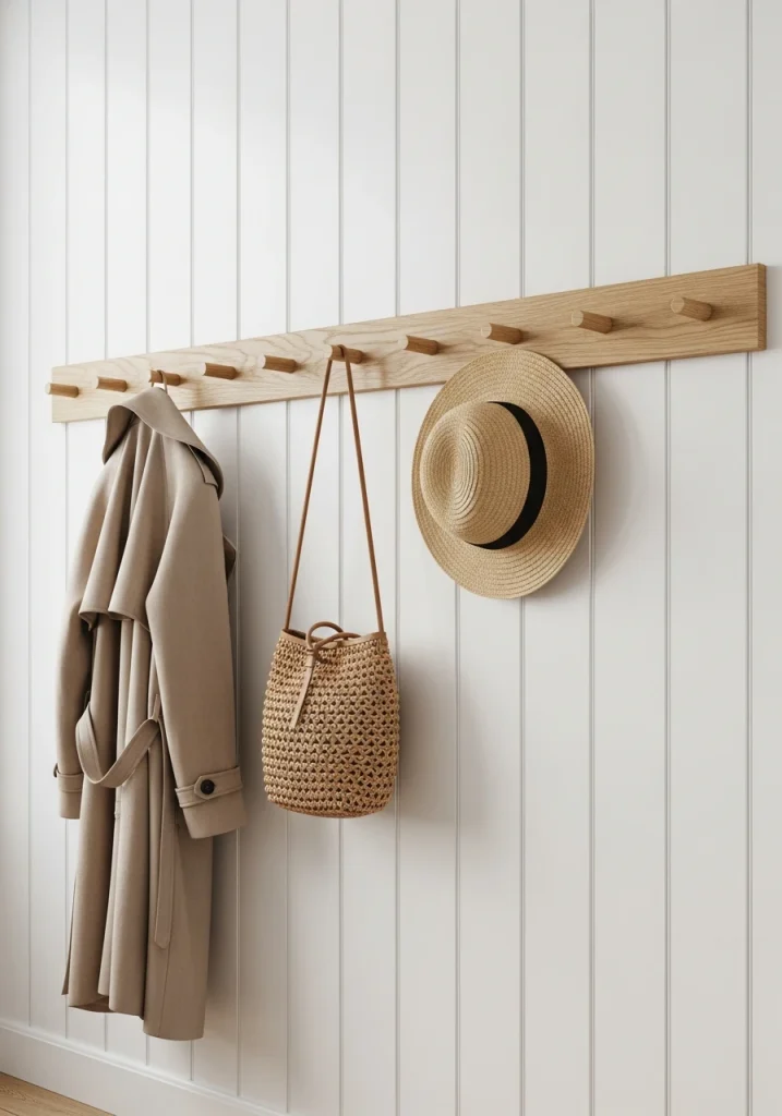 A stylish smart design makeover that is perfect for a modern farmhouse or Scandinavian home. Replace bulky wall hooks with a simple Shaker-style peg rail. This is a horizontal wood plank with simple round pegs that is incredibly functional for hanging coats bags and hats while looking minimalist and chic.