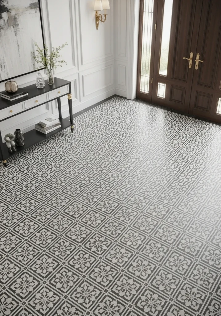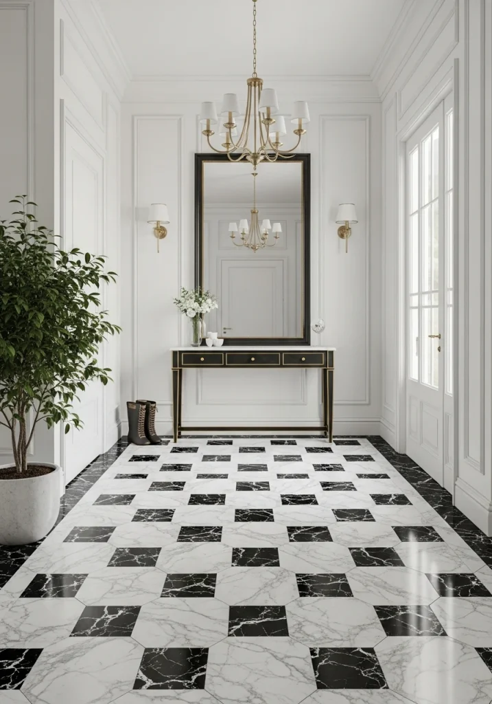This classic retro pattern is back in a major way for 2026. A checkerboard tile floor (in classic black and white or a softer marble gray and white) instantly adds a sense of history glamour and high-design flair to an entryway (inspired by your reference image).