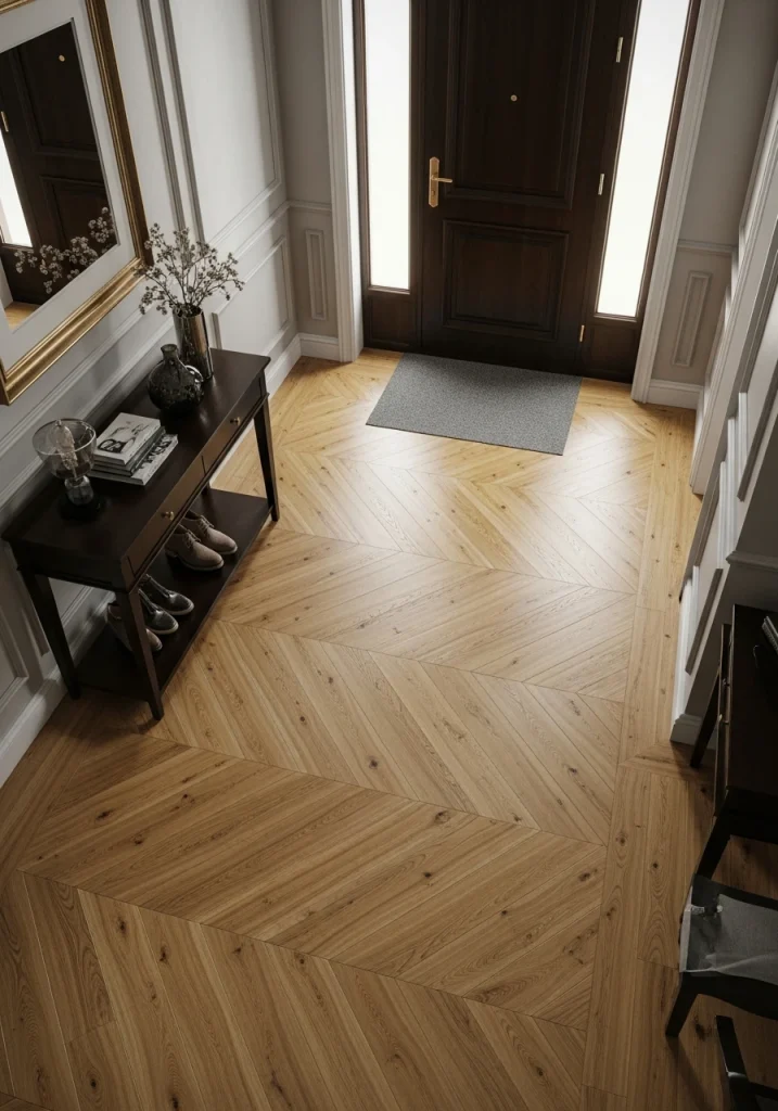 For a timeless elegant and high-end look that guides the eye. Remodel your hallway floor with solid hardwood laid in a classic herringbone pattern. This adds a subtle geometric texture a sense of European elegance and makes the hallway feel more dynamic.