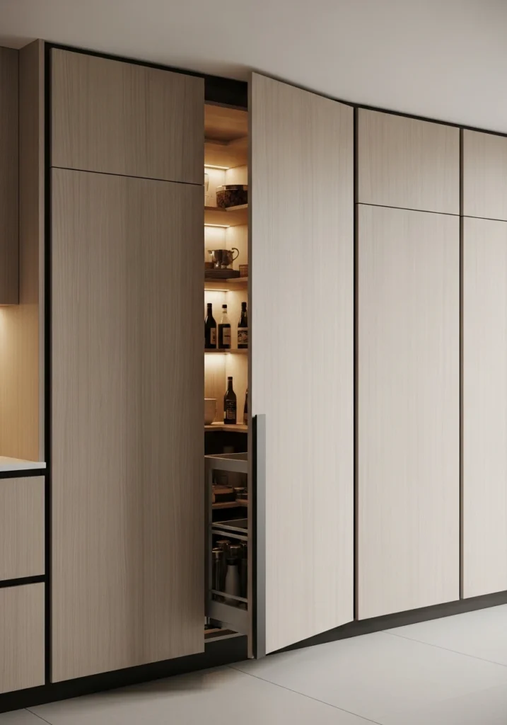 A must-have for a seamless, minimalist look. This remodel involves creating a walk-in pantry where the entrance is a “secret” door, disguised to look like a part of your regular kitchen cabinetry. It’s often a flat, handle-less panel that uses a “push-to-open” mechanism.