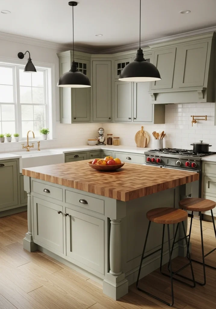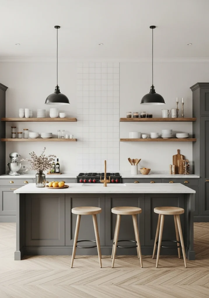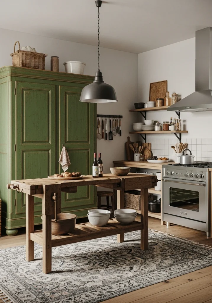 A major 2026 trend that moves away from wall-to-wall, built-in cabinets. This layout uses a curated mix of freestanding, “furniture-like” pieces, such as an antique armoire as a pantry, a rustic work table as an island, or a vintage hutch for dishes. It creates a “collected,” personal, and more relaxed, European feel.