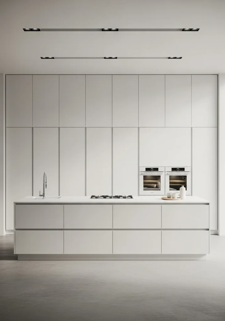 This is the ultimate, modern storage solution. This layout dedicates one entire wall of the kitchen to floor-to-ceiling, pantry-style cabinetry. This consolidates all your storage—food, dishes, small appliances—in one “wall,” keeping the rest of the kitchen, especially the island, feeling open and uncluttered.