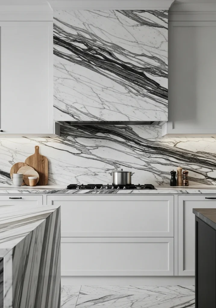 For a very clean, seamless, and high-end, “quiet luxury” look, this remodel involves eliminating a tiled backsplash. Instead, you continue the same, beautiful material from your countertop up the wall to create a solid, “slab” backsplash. This is particularly stunning with a veined marble or quartz.