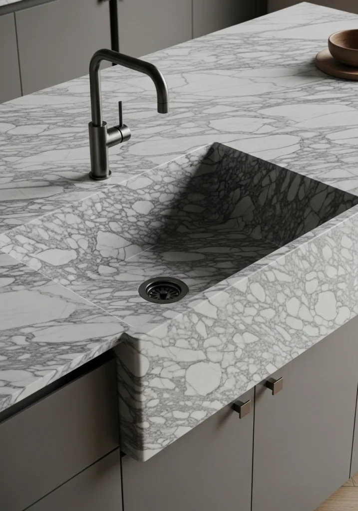 An innovative and seamless, luxury, remodel idea. The sink is made from the very same, slab of natural, stone or, quartz as the, countertop. This, creates a, continuous, sculptural, and, monolithic, look with, no, seams, and, is, incredibly, easy to, clean.