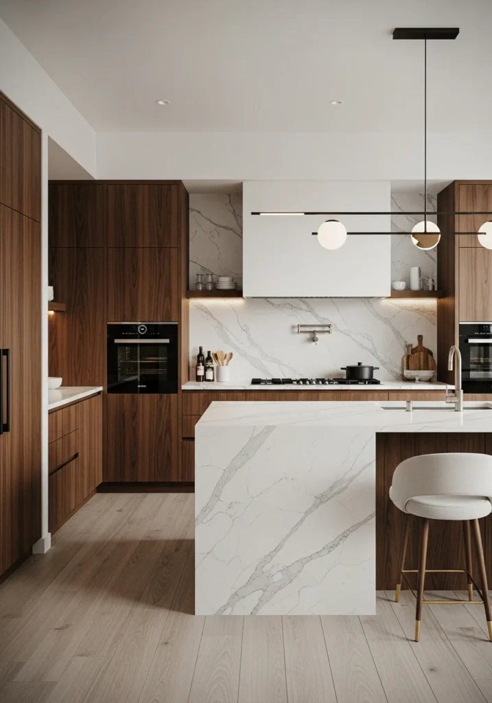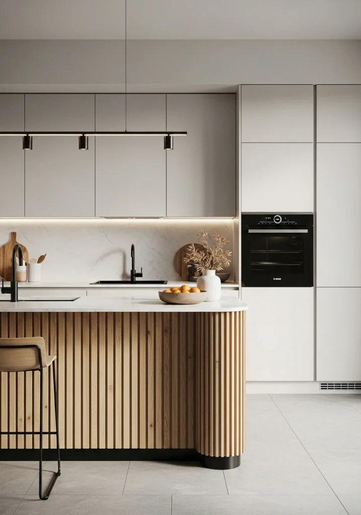 Texture is paramount in 2026. A “fluted” or “reeded” wood finish on your cabinets or island is a high-end, designer-approved trend. This features a beautiful, 3D, vertical, grooved pattern that adds a sophisticated, textural, and slightly Art Deco element to your kitchen.