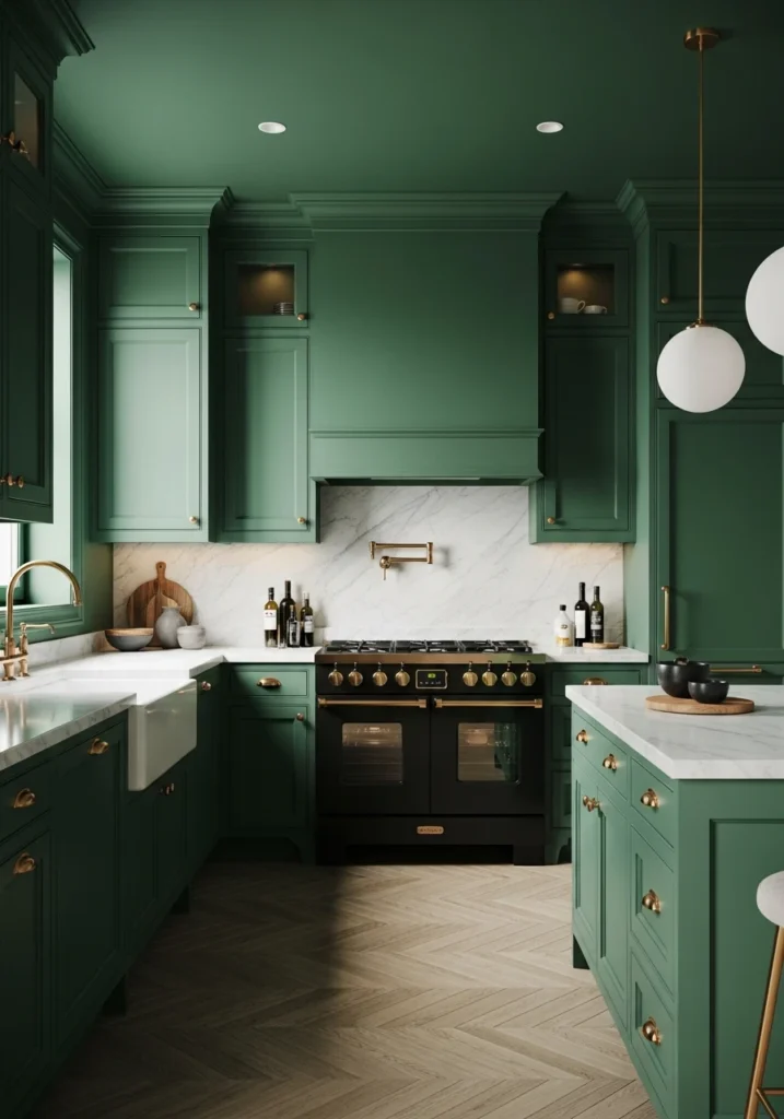 A bold, immersive, and high-design idea. “Color drenching” involves painting the cabinets, the walls, the trim, and even the ceiling all in one, single, sophisticated, and often moody color. A deep, forest green or a rich, navy blue creates a seamless, enveloping, “jewel-box” effect.