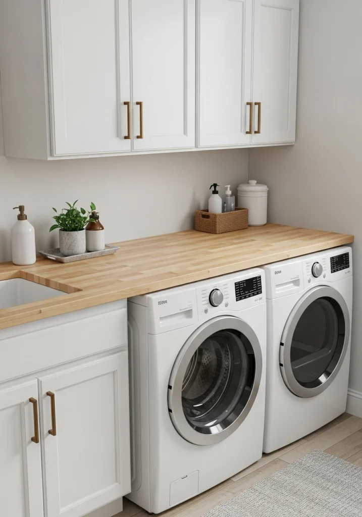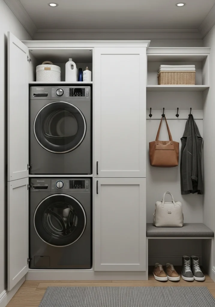 A classic solution for any home is the “laundry closet.” This can be located in a hallway, a kitchen, or a mudroom. A set of bifold or sliding doors can be used to neatly conceal the washer, dryer, and a few, simple, overhead shelves, keeping the visual clutter of laundry hidden from your main living spaces.