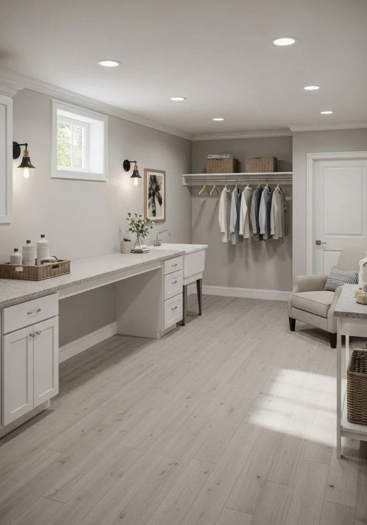 In a more square-shaped room, an L-shaped layout can provide the perfect, ergonomic “work triangle.” Place your washer and dryer along one wall and a utility sink and a large, folding counter along the adjacent wall. This creates a very open and functional central space and a clear separation of “wet” and “dry” zones.