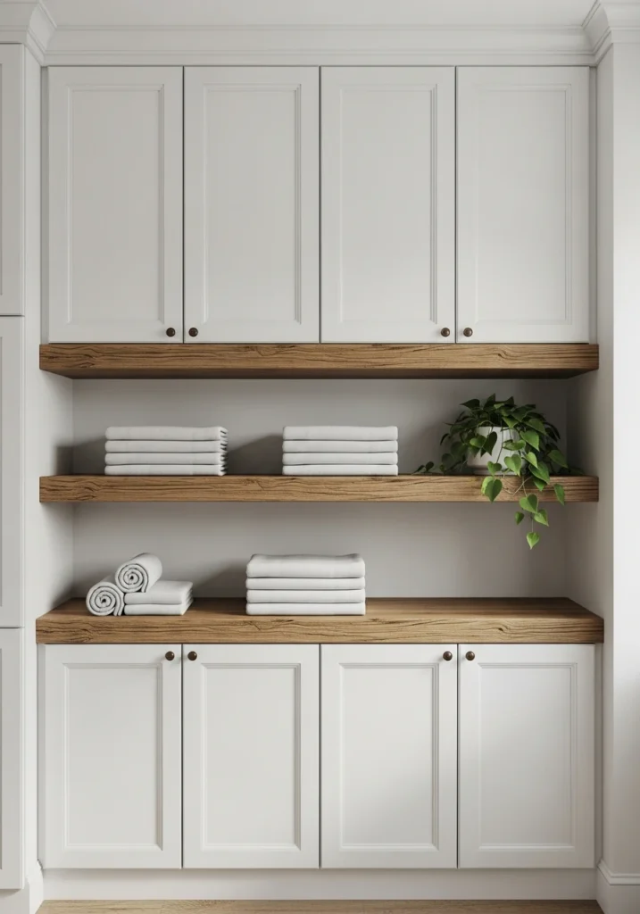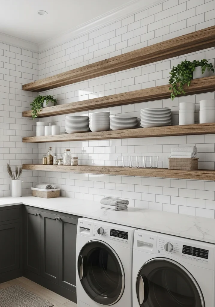 For a look that is modern, airy, and more budget-friendly than full upper cabinets, a set of simple, floating shelves is a fantastic choice. As seen in one of your reference images, they are perfect for placing above your folding counter or your washer and dryer. They provide easy-to-access storage for items you use every day and are a perfect spot for a bit of stylish, decorative flair.