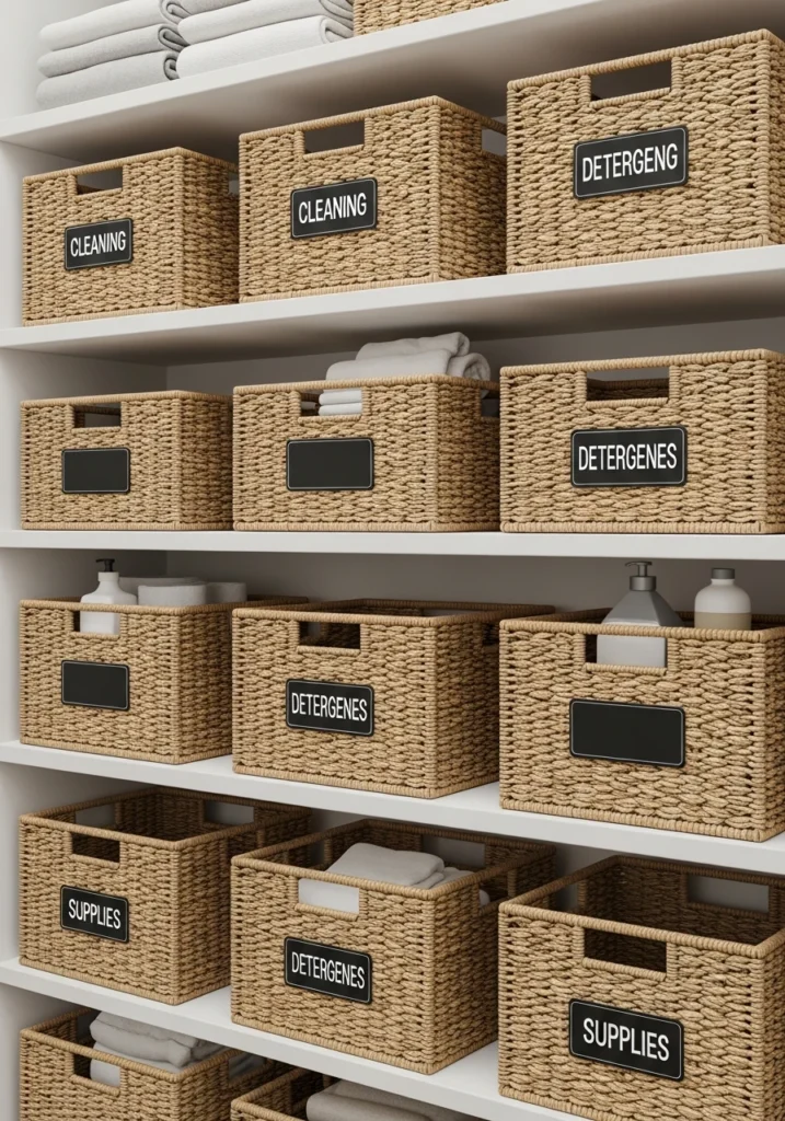 To keep your open shelves looking neat, organized, and stylish, decant your smaller items into a set of beautiful, matching baskets or bins. This is a classic professional organizer’s trick. Woven hyacinth or rattan baskets add a touch of warm, natural texture, while clear, plastic bins allow you to see the contents at a glance.
