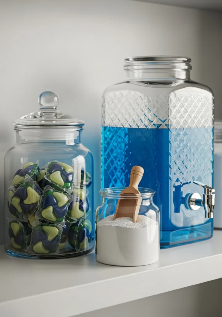 For a truly beautiful, “Pinterest-worthy” laundry room, decant your messy, branded, powder detergents, pods, and fabric softeners into a set of large, beautiful, uniform, glass jars and dispensers. You can place them on an open shelf or on your countertop, turning your everyday supplies into a stunning, stylish display.