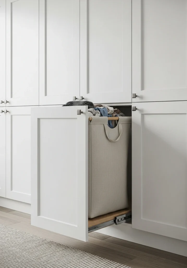 Instead of having ugly, plastic laundry baskets cluttering up your floor, a truly innovative and seamless solution is to build your hampers directly into your cabinetry. A pull-out, tilt-out, or a deep drawer cabinet can be designed to perfectly hold one, two, or even three, removable laundry bags for pre-sorting your lights, darks, and delicates.