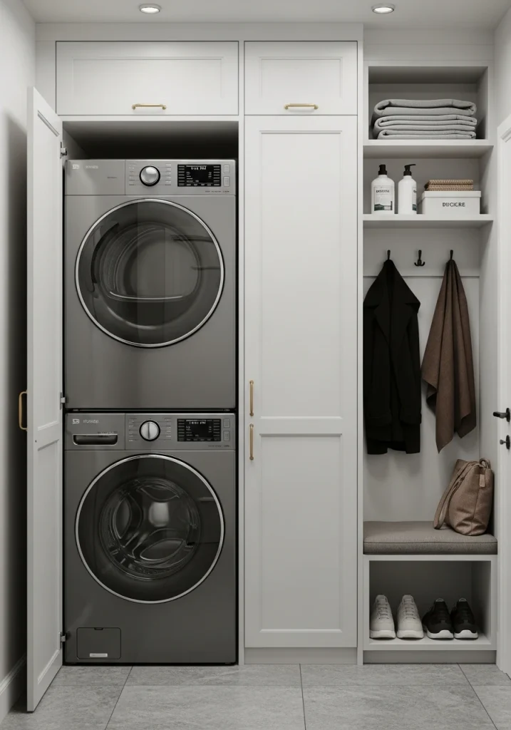 A top 2026 trend for a seamless, minimalist makeover. This layout hides the entire laundry station behind a set of beautiful, floor-to-ceiling cabinet doors that match the surrounding kitchen or hallway cabinetry. When closed, the laundry is completely invisible, perfect for an open-plan living space.