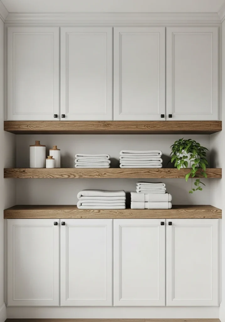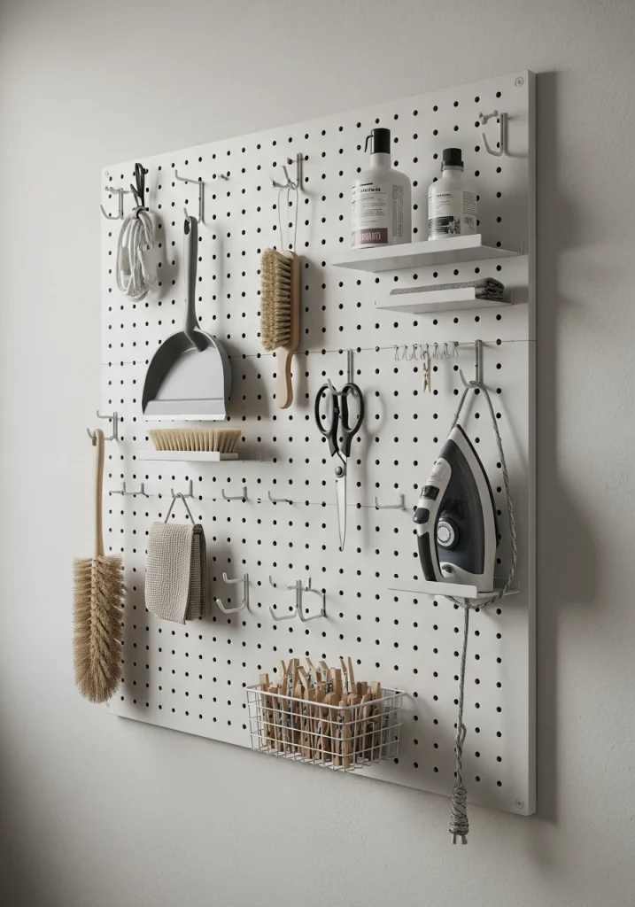 A pegboard is the ultimate in flexible, vertical storage for a 2026 remodel. It can be mounted on any free wall and can be customized with a huge variety of hooks, shelves, and baskets. It’s the perfect, functional spot for hanging your ironing board, your lint brushes, scissors, and other light, hanging tools.
