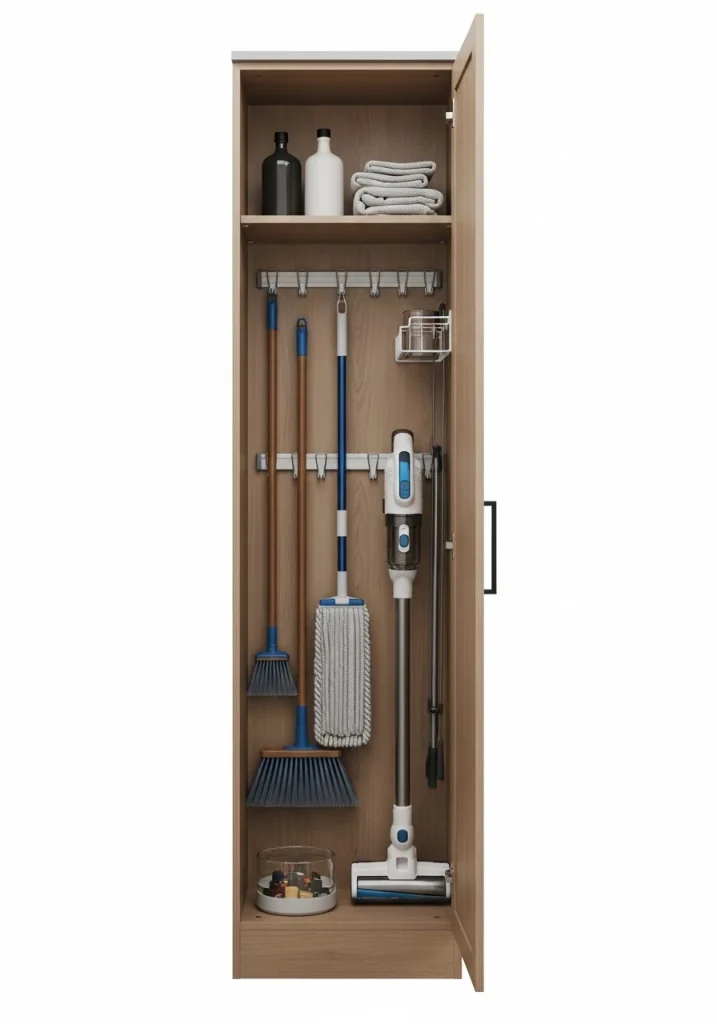 A major source of clutter is the collection of tall, awkward, cleaning tools. A truly innovative remodel solution is to dedicate one, tall, pantry-style cabinet to be a custom “broom closet.” It can be outfitted with special, wall-mounted clips and racks to keep all of these tools upright, organized, and hidden from view.