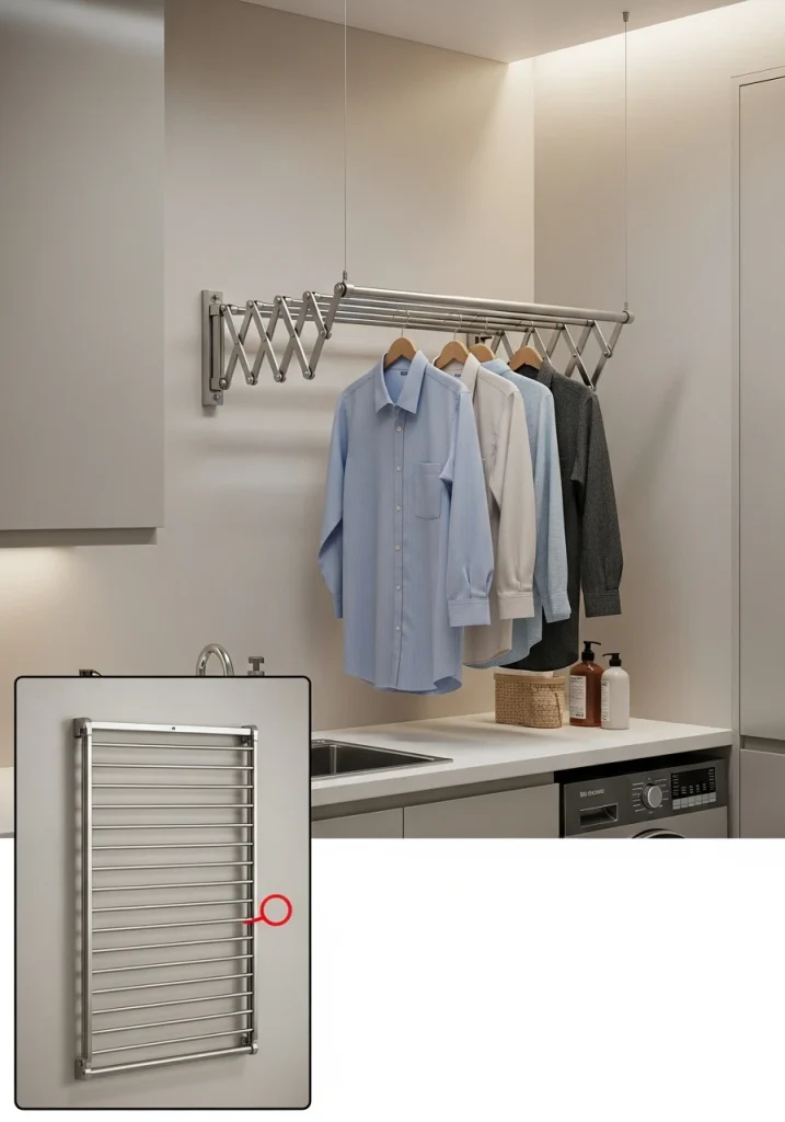 A classic, pulley-style, or a modern, retractable drying rack that is mounted on the ceiling is a fantastic, space-saving solution. It allows you to dry a large number of clothes in the warm air near the ceiling, without taking up any of your valuable floor space. This is a 2026-trend that embraces a vintage, “modern cottage” feel.