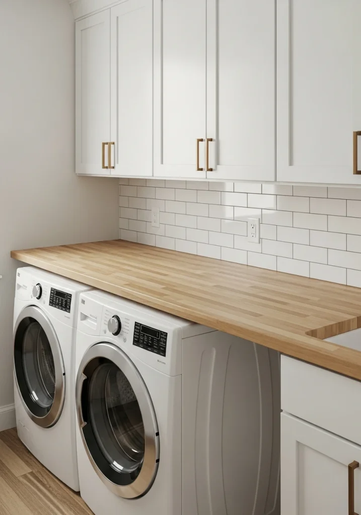 This is the most popular and ergonomic makeover for a functional laundry room. Placing your front-loading machines side-by-side allows you to install a deep, continuous countertop directly over them. This creates a massive, comfortable-height surface for sorting, treating, and folding laundry.