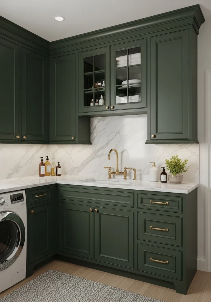 Embrace a dark, dramatic, and sophisticated 2026 look by painting your laundry room cabinets a deep, moody color. A rich, inky navy blue, a deep, forest green, or a dramatic, charcoal gray can make the space feel incredibly chic, cozy, and luxurious.