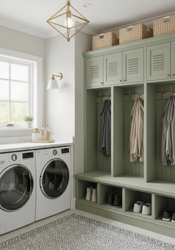 This is one of the most popular and practical makeover ideas for 2026. Combine your laundry room with your home’s secondary entrance to create a hardworking mudroom. This layout typically includes a bench, hooks, or lockers for coats and bags, alongside the washer and dryer. It’s the perfect “drop zone.”