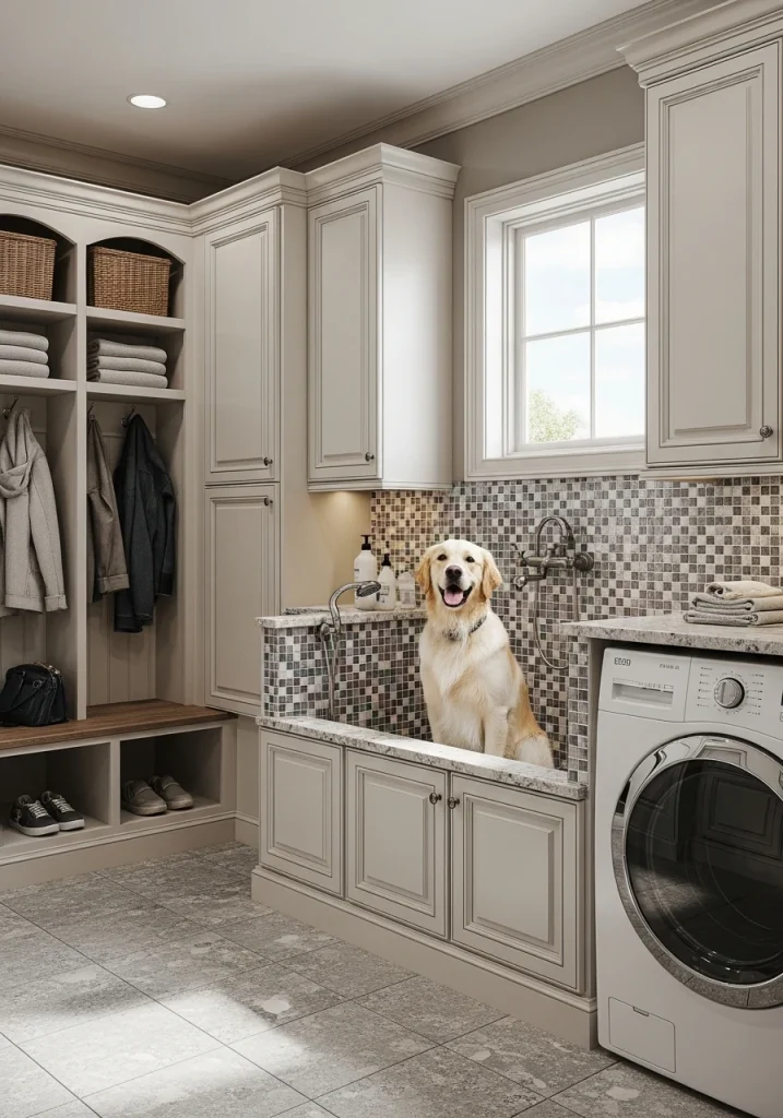 If your laundry or mudroom is the main entrance for your pets, a built-in pet washing station is an incredibly luxurious and practical remodel idea. This is a low, tiled, shower-like basin with a handheld-sprayer, designed specifically for washing muddy paws, as seen in one of your reference images.