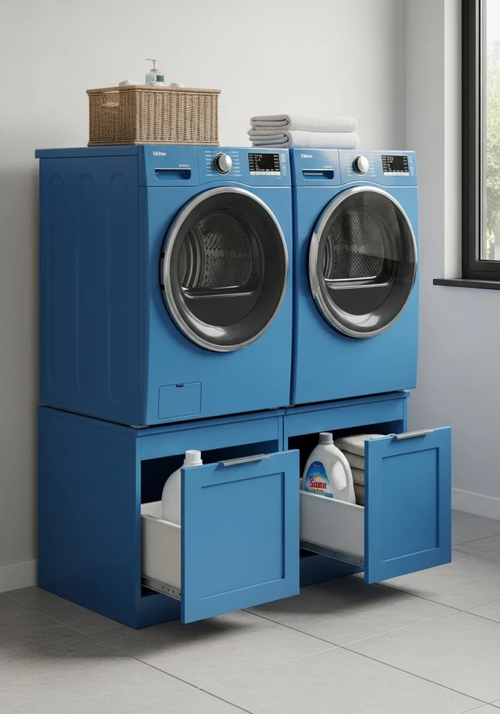 A smart ergonomic and storage-based makeover. Elevate your side-by-side, front-loading machines by placing them on top of their matching pedestal drawers. This serves two key functions: it raises the appliances to a more comfortable height (no more deep bending), and the deep drawers underneath provide massive, hidden storage.