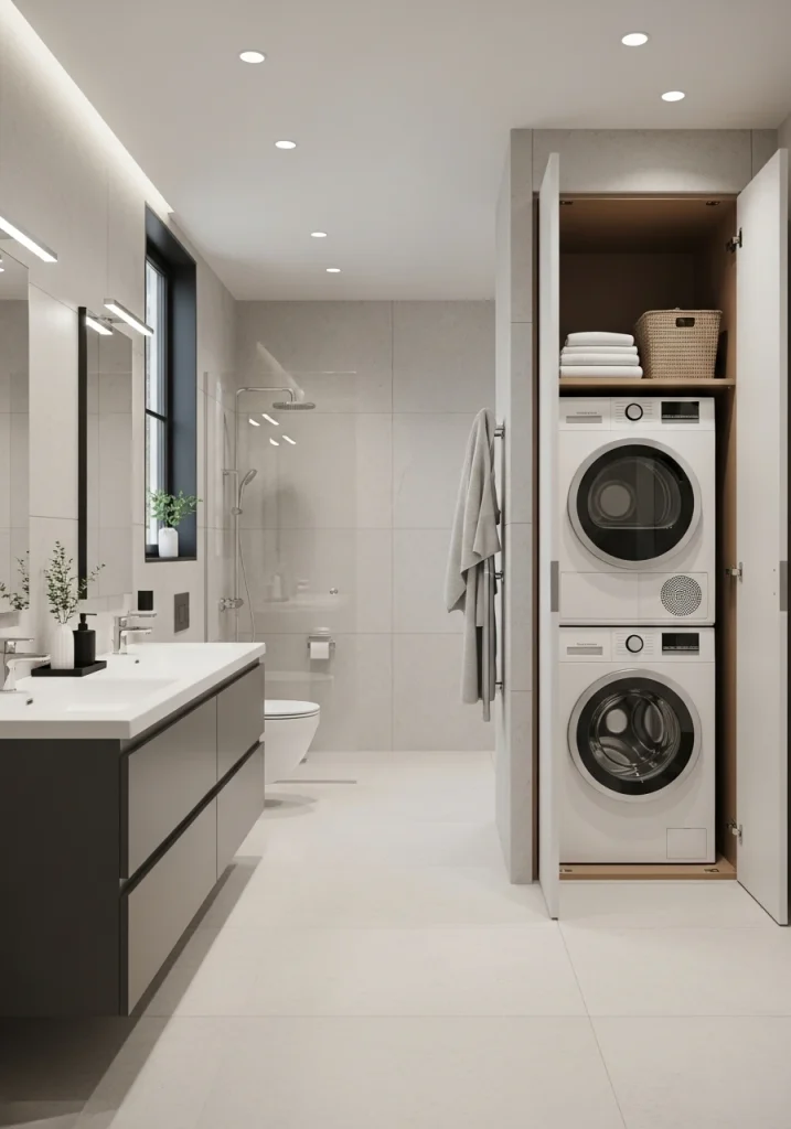 Another practical, space-saving layout for small homes is to combine the laundry with a guest or a secondary bathroom. A makeover is the perfect time to tuck a stacked washer and dryer unit into a custom, built-in alcove or a closet within the bathroom, which can often share the plumbing.