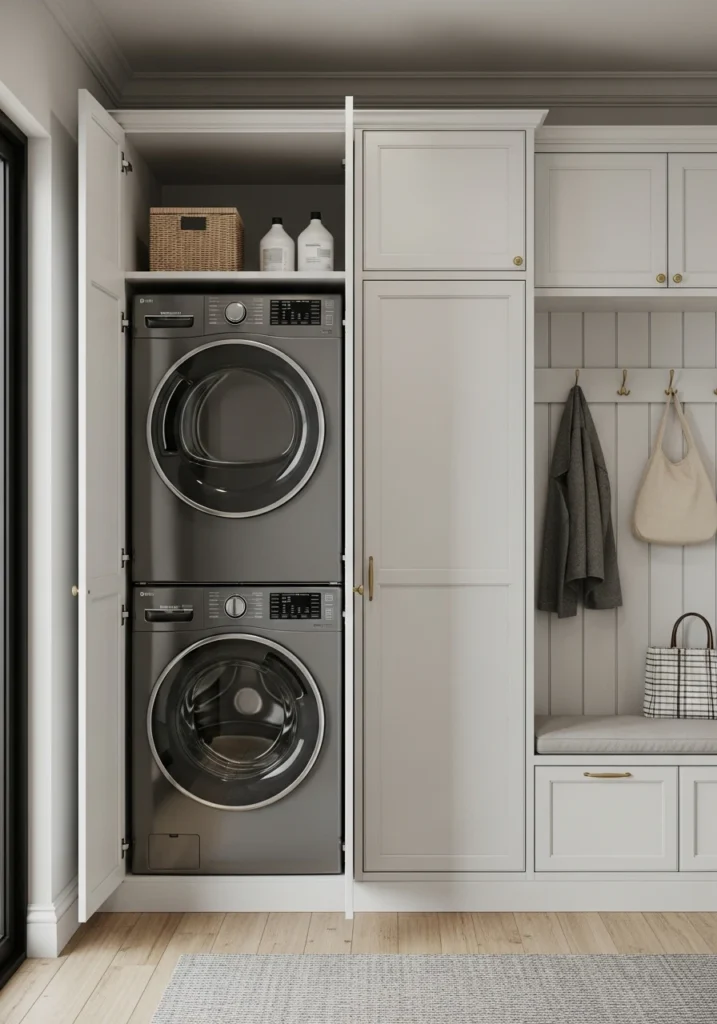 A top 2026 trend for a seamless, minimalist look. This layout hides the entire laundry station behind a set of beautiful, floor-to-ceiling cabinet doors that match the surrounding kitchen or hallway cabinetry. When closed, the laundry is completely invisible, perfect for an open-plan living space.