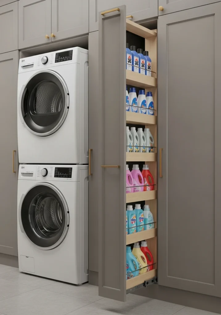 In many laundry room layouts, you end up with an awkward, 6-to-9-inch, narrow, vertical gap—often next to the dryer or a sink. A brilliantly innovative way to use this otherwise wasted space is to install a narrow, pull-out, vertical drawer or “filler” cabinet. This is the ideal, hidden spot for storing bottles of detergent, stain removers, and dryer sheets.